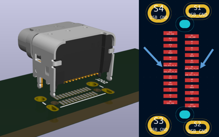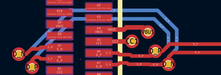 The USB-C connector has the differential signals coming out on both rows of the footprint. The pads are 0.3mm wide and 0.5mm pitch leaving only 0.2mm between them which is tight when you consider that basic fabrication abilities for low cost PCBs require trace widths >0.15mm.